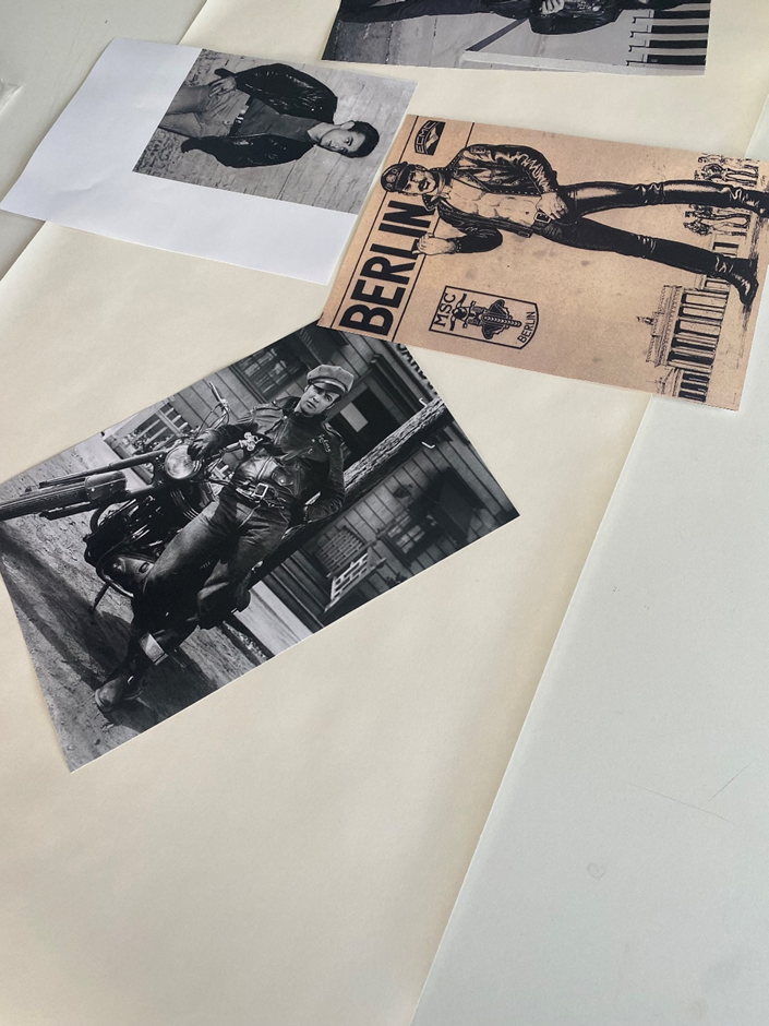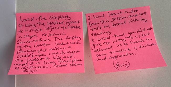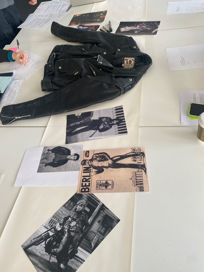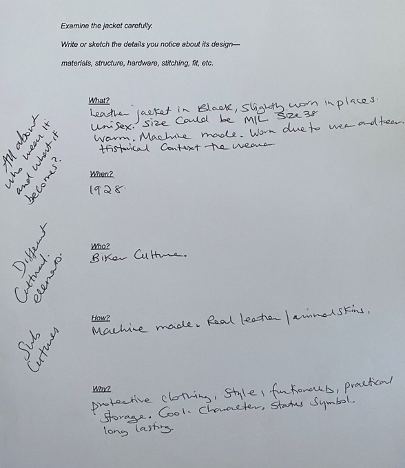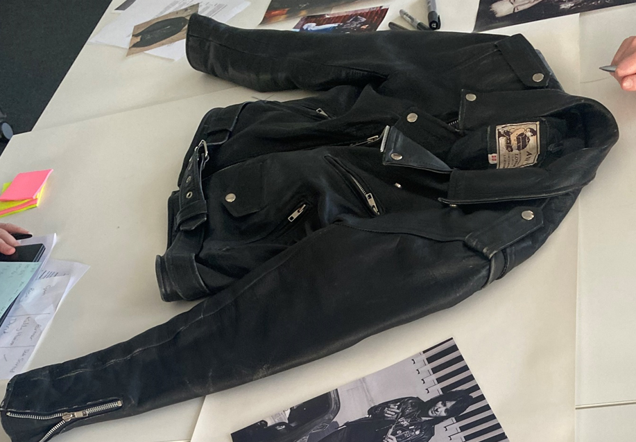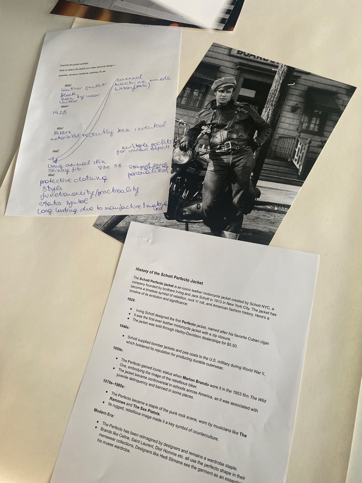 Rory was unsure to hand out the historical timeline first before giving to us the question sheet to fill in. We voted and they decided to give this to us afterwards. This then allowed us to use our prior knowledge, to discuss with our partners the information required and to analyse the accompanied images to tell its own story. As a result, discussions were created and this encouraged us to reflect on our own memories of a biker jacket. One of my peers tried on the jacket to be immersed in the experience. Others including me touched the leather and identified with the worn imprints and imperfections of time. This brought about conversations about sustainability and the environment.