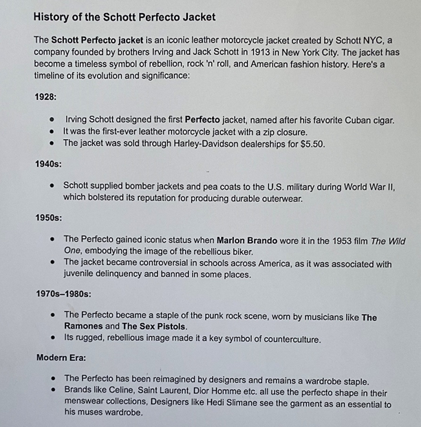 We later received an historical timeline of the Perfecto jacket which solidified our discussions, or we learnt new facts.